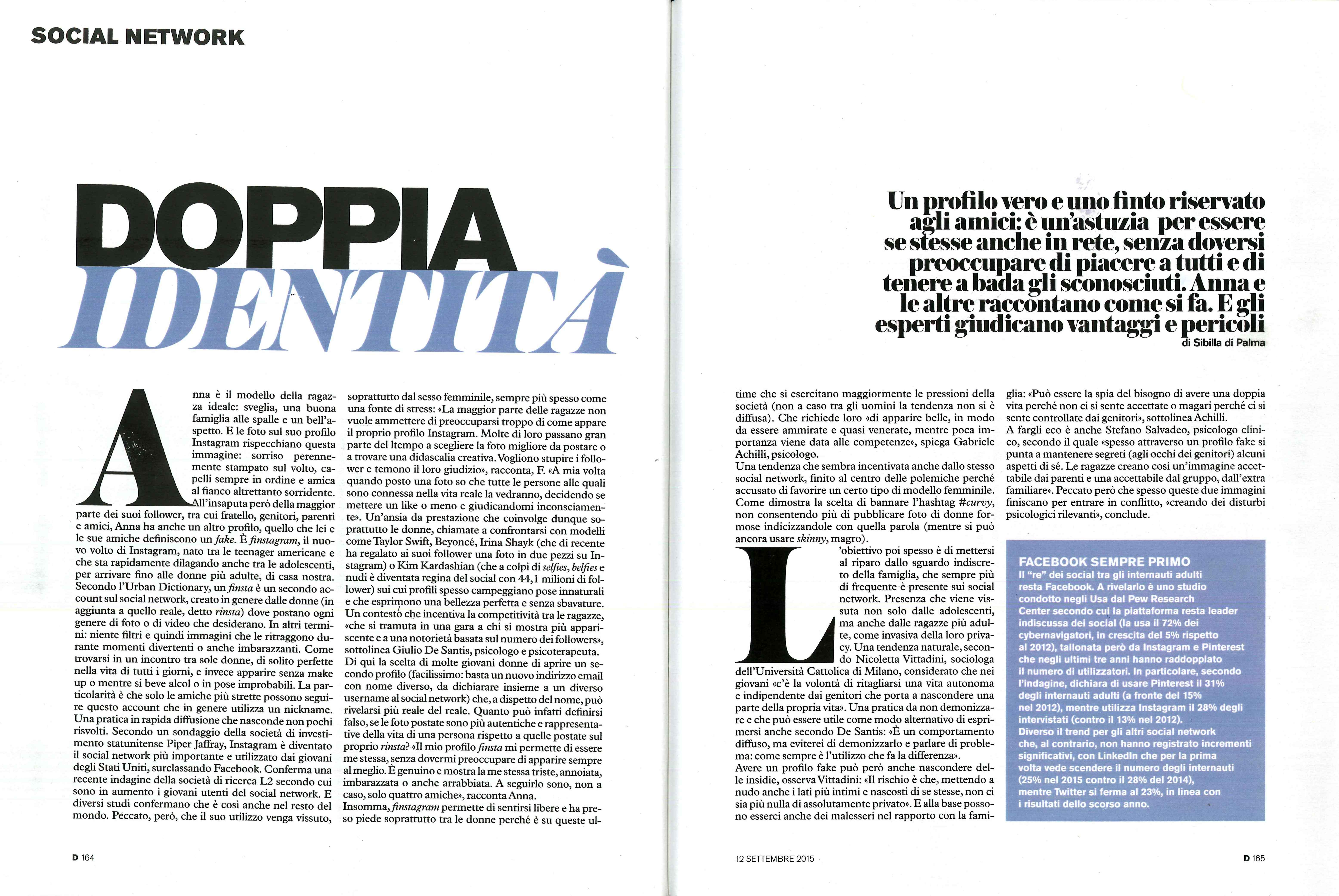 D La Repubblica 12.09.2015 – Doppia Identità – Fenomeno Finstagram, un profilo vero e uno finto riservato agli amici. Un’astuzia per essere se stesse anche in rete. Gli esperti giudicano vantaggi e pericoli – di Sibilla di Palma con la consulenza del Dott. Giulio De Santis